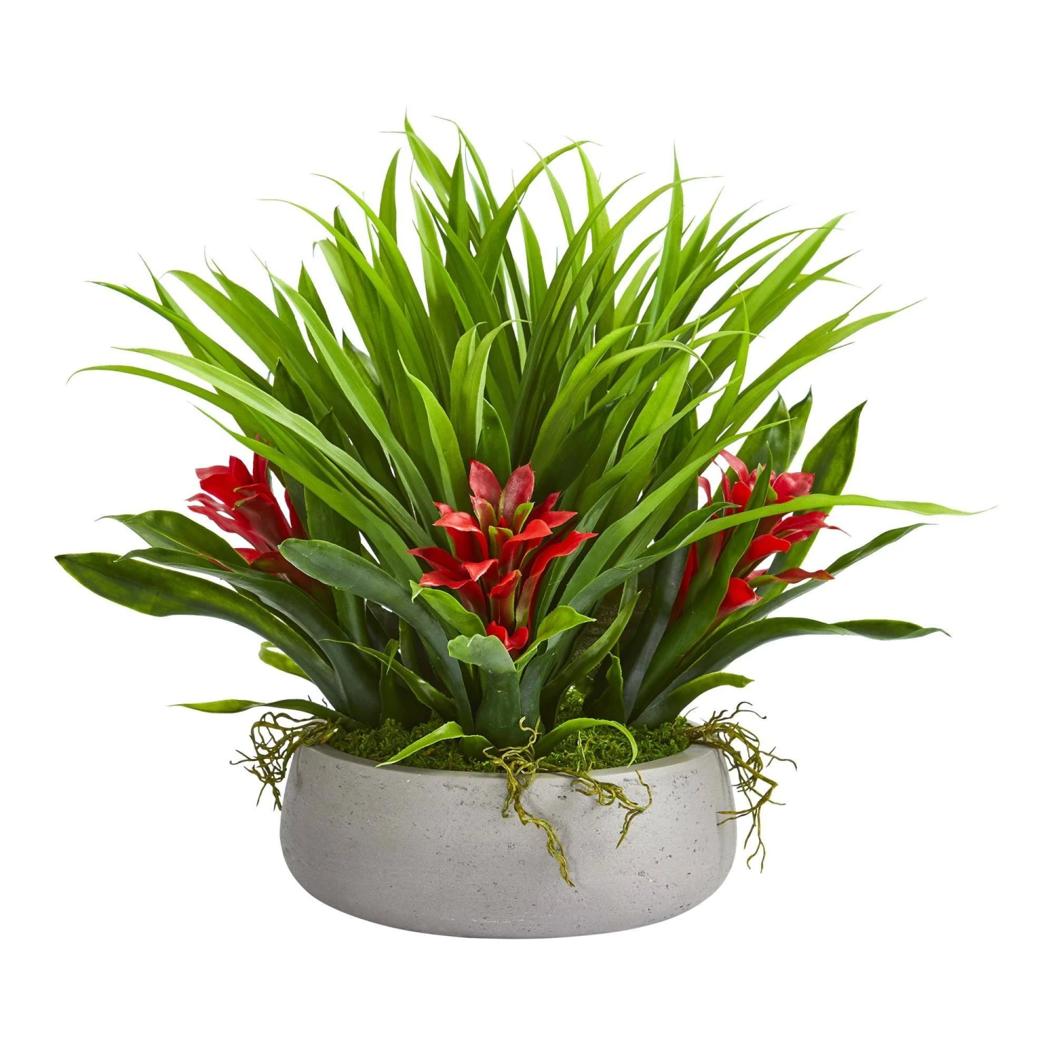 16” Bromeliad & Grass Artificial Plant In Ceramic Vase