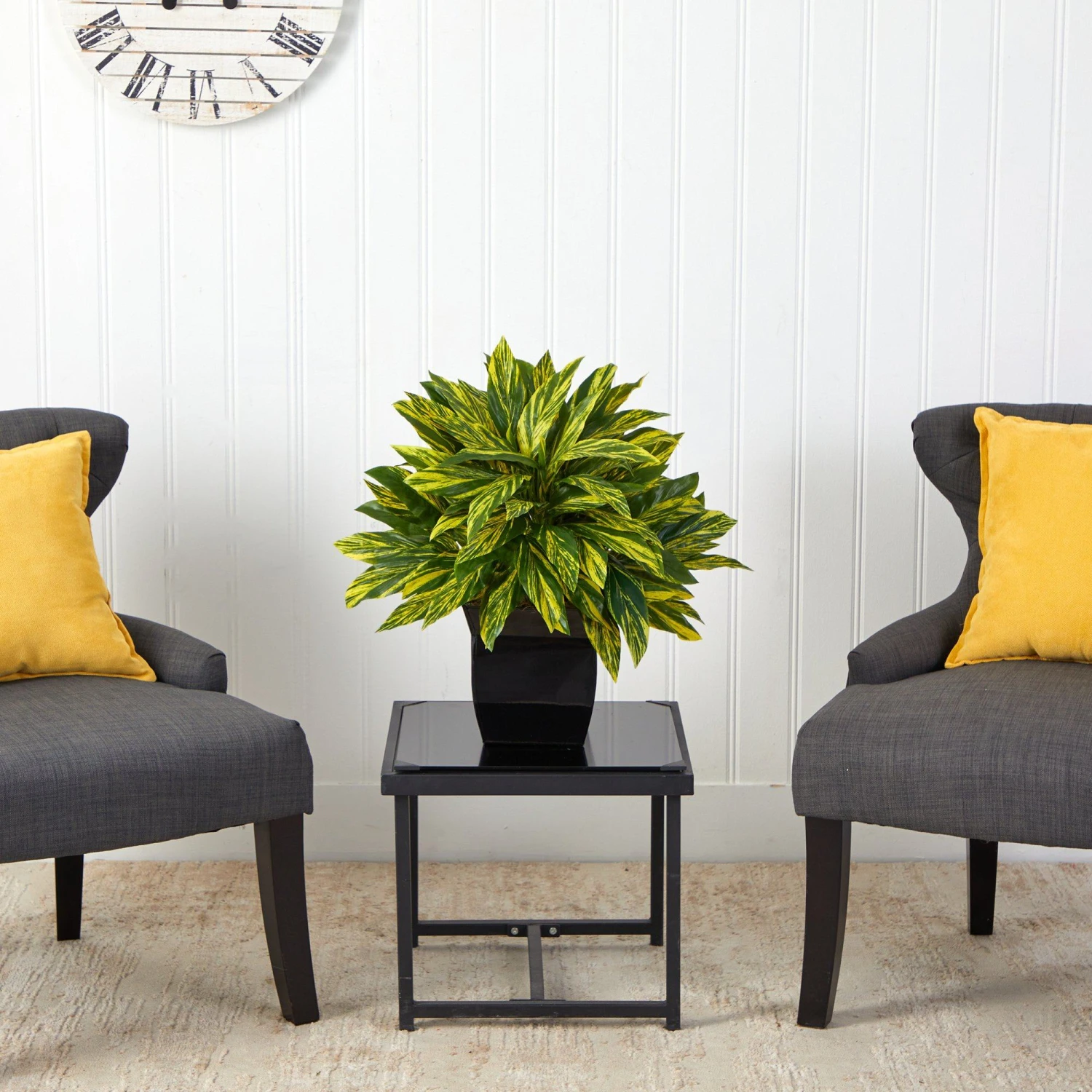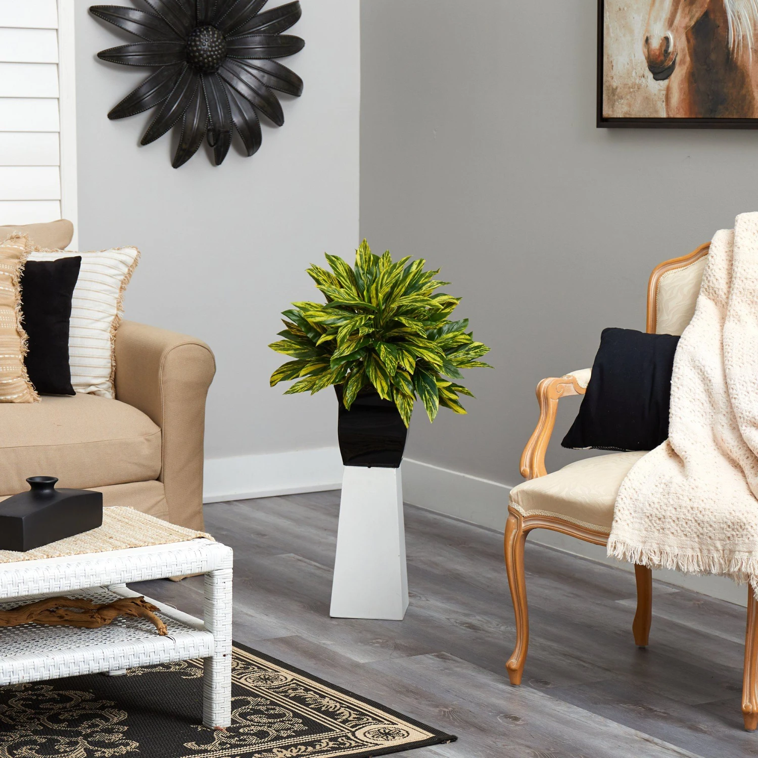 Cure your wanderlust with this eclectic Tradescantia Artificial Plant. Variegated green leaves with an ombre-like yellow bring color and green foliage to any space. Recreate the jungle look effortlessly; the leaves even feel free to touch! Standing 18” from a black metal planter (included in height), bring the sight of exotic lands to your living areas. Perfect for a lonely corner, office desk and makes a lovely gift.