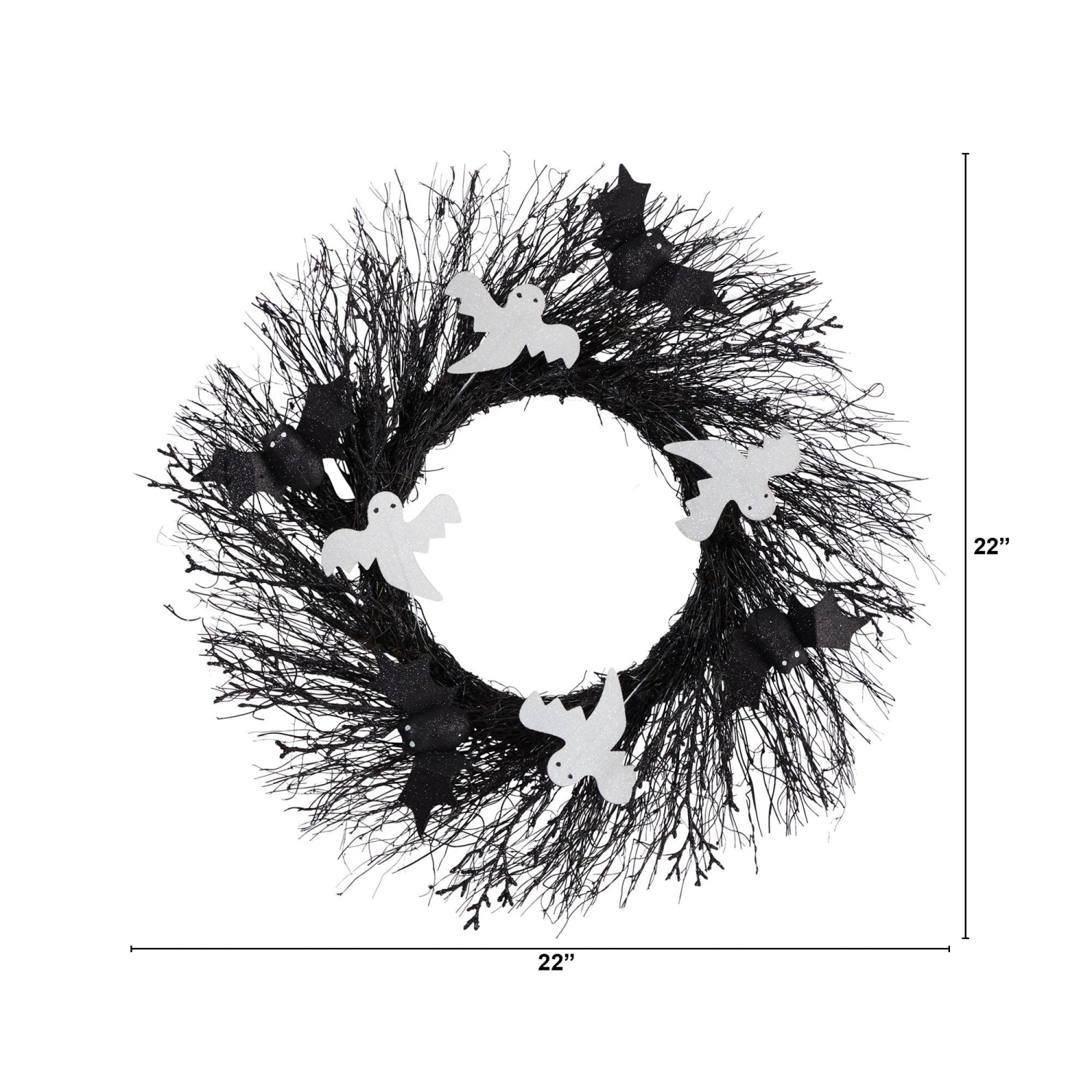 Create your own mini haunted house with this Spooky Bats and Ghosts Halloween Wreath. Black twigs are accented by white and black spooky bats adding a scary touch. Stand out this Halloween season by hanging in any space in need of a festive touch. With a diameter of 22′ house in any door or bare wall. Makes a fine gift too.