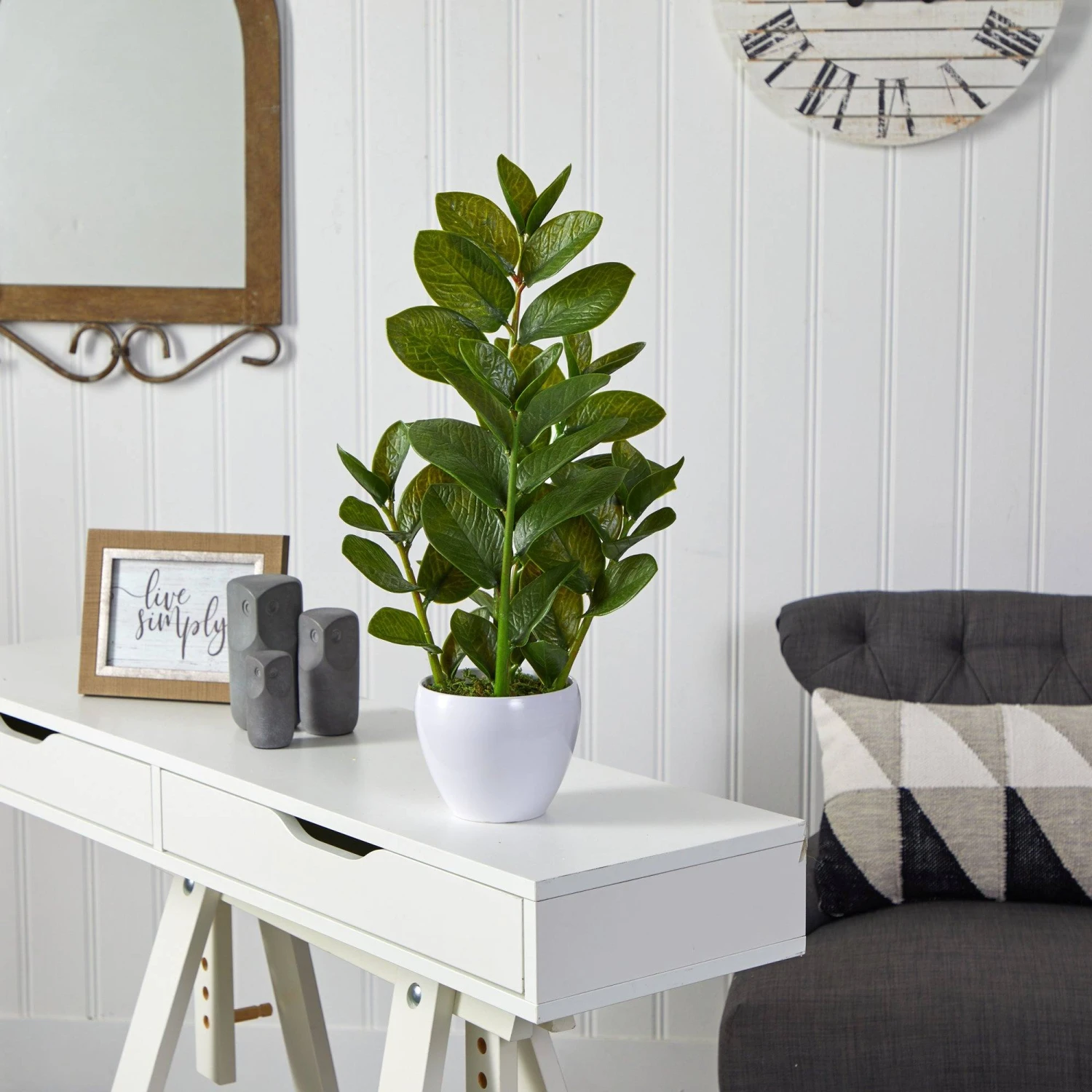 Social media’s trendiest plant is here for you to enjoy, maintenance-free. This lifelike artificial ZZ plant removes the guesswork, allowing you to enjoy its’ splendor without the upkeep. Thick, green leaves form feather-like foliage that brings depth and lines to spaces. Standing 22” from a white planter, this faux plant is the perfect accent for desktops and compact spaces. Recreate the African jungle look in your office, kitchen nook, bedside table, bathroom, or mantel.