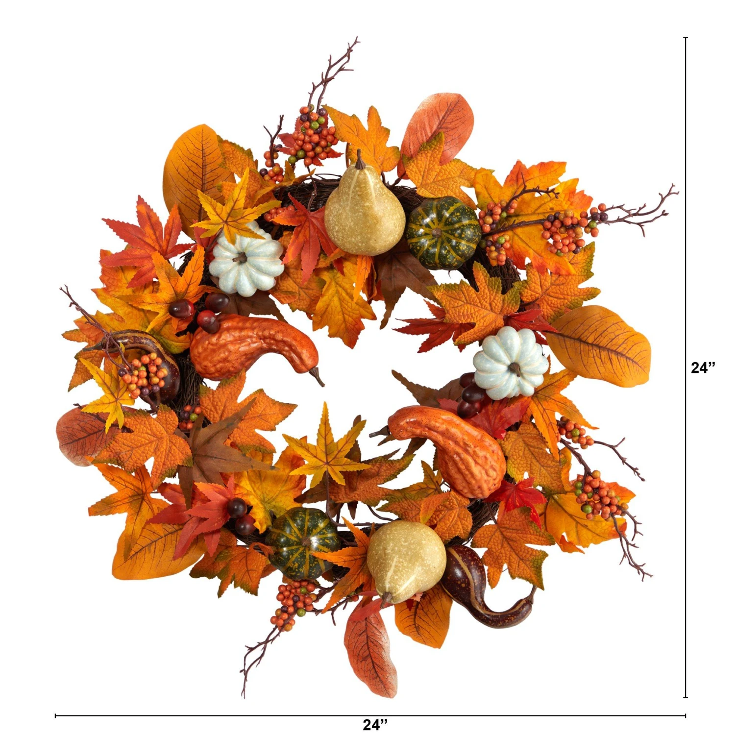Update your favorite home decor accents while adding a hint of natural beauty to your home or office entrance with this artificial wreath intricately designed with glossy, overlapping maple leaves in fall colors, highlighted throughout with different textures ranging from berries and pumpkin gourds. A charming, festive accent that evokes Southern charm and elegance, this 24″ in diameter decorative wreath would undoubtedly transform a bare wall or doorway with its forever lasting beauty.