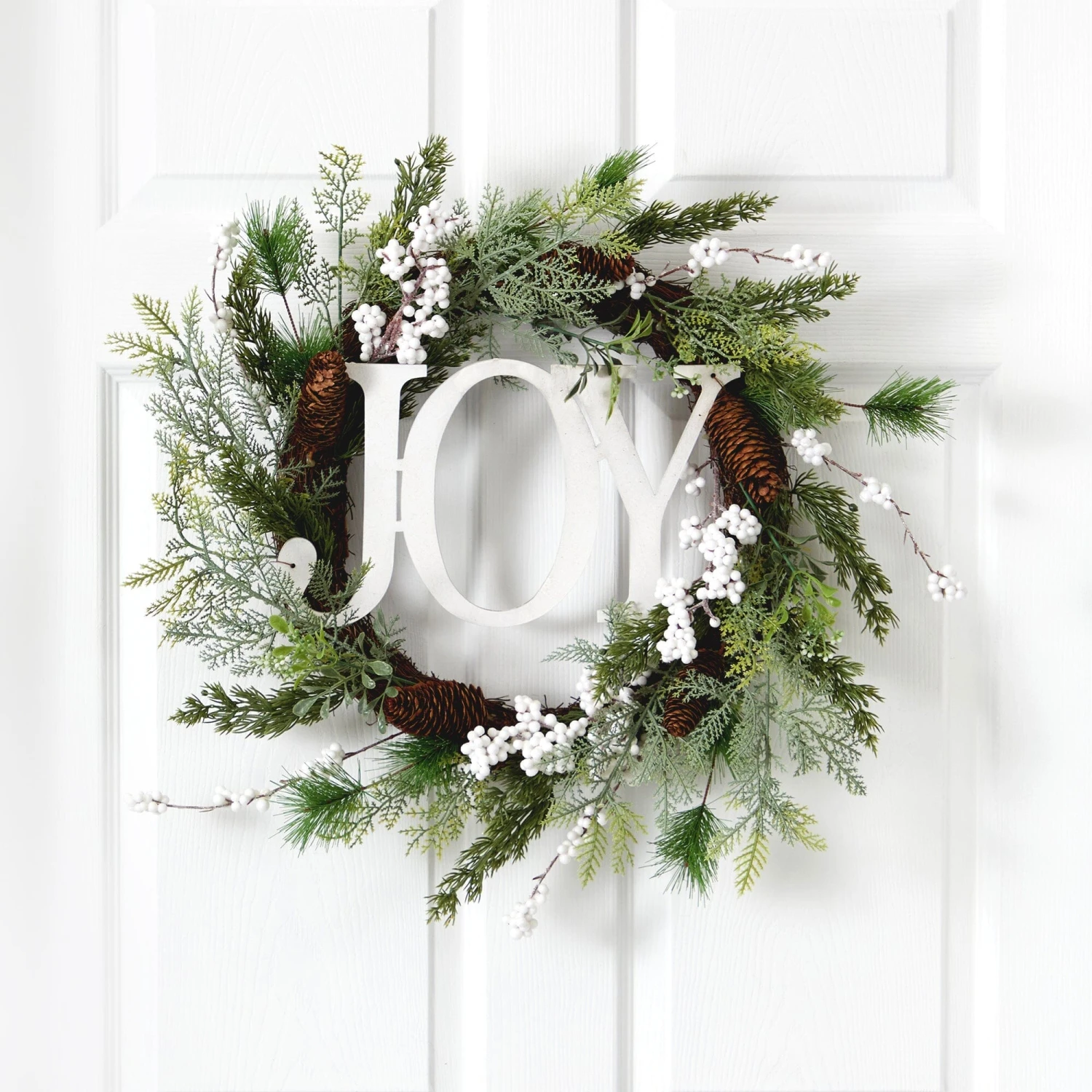 Nothing says Christmas like a classic Christmas artificial wreath. Soft-hued evergreens add an instant sense of freshness and are accented by faux berries and pinecones so lifelike you’ll think they’re real. Spread holiday cheer with the joy lettering across the wreath. With a dimension of 24″, house in any bare wall or door.