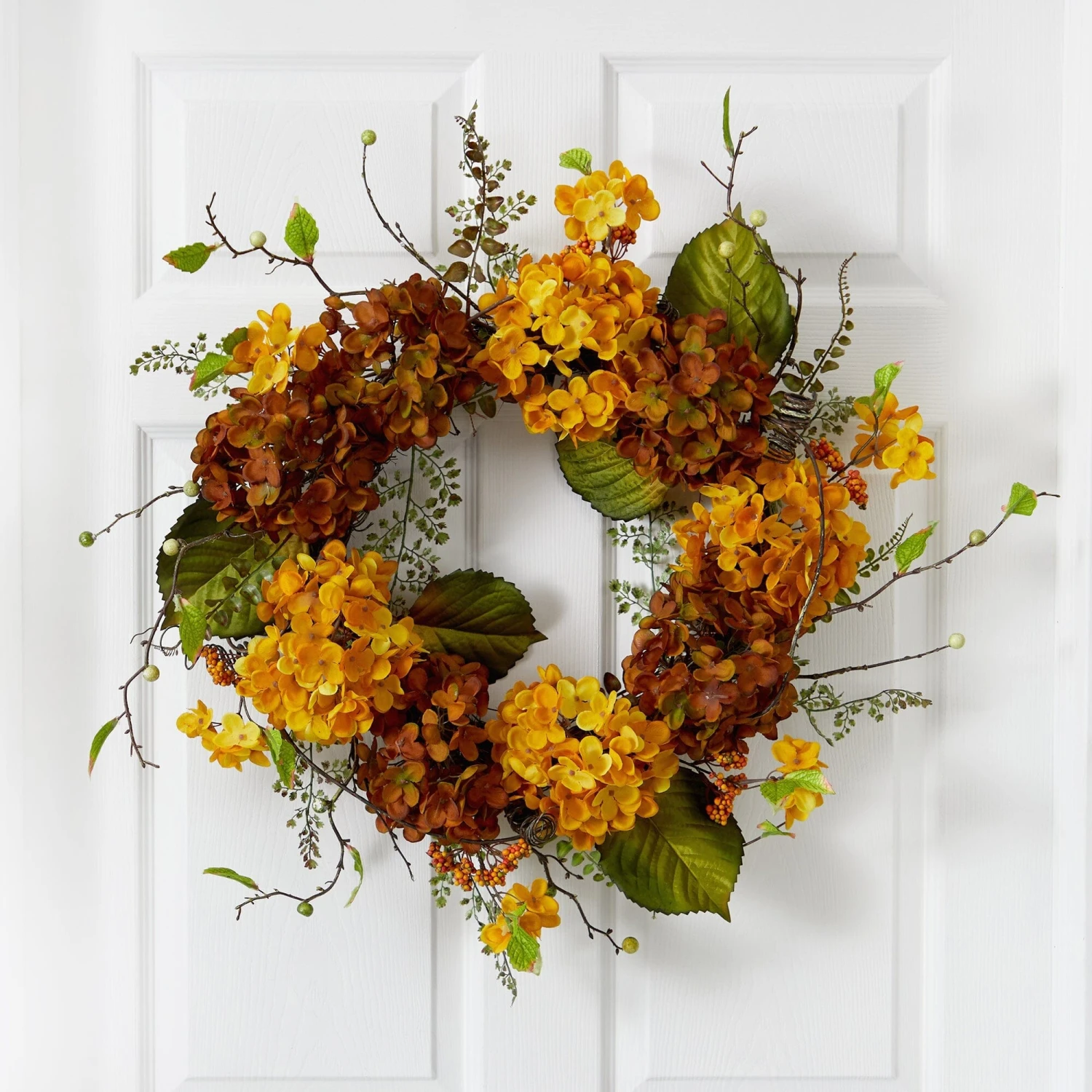 Messy, yet striking, this Fall Hydrangea Artificial Wreath brings the fall foliage to your space. Inspired by nature, hydrangeas in a palette of dramatic colors sit on a bed of green leaves, accented by berries. Delicately crafted by florists, each high-quality piece is sure to last year after year. With a dimension of 24” add to any bare wall or door. Perfect for Thanksgiving dinner.