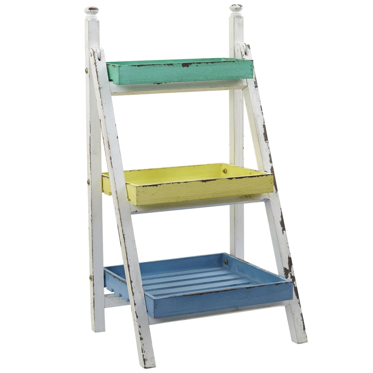 At a little over two feet tall, this decorative stand is perfect for any room. It has blue, yellow, and mint pastel shelves. The distressed finish pairs well with farmhouse and French country decor. Use for storage or display.