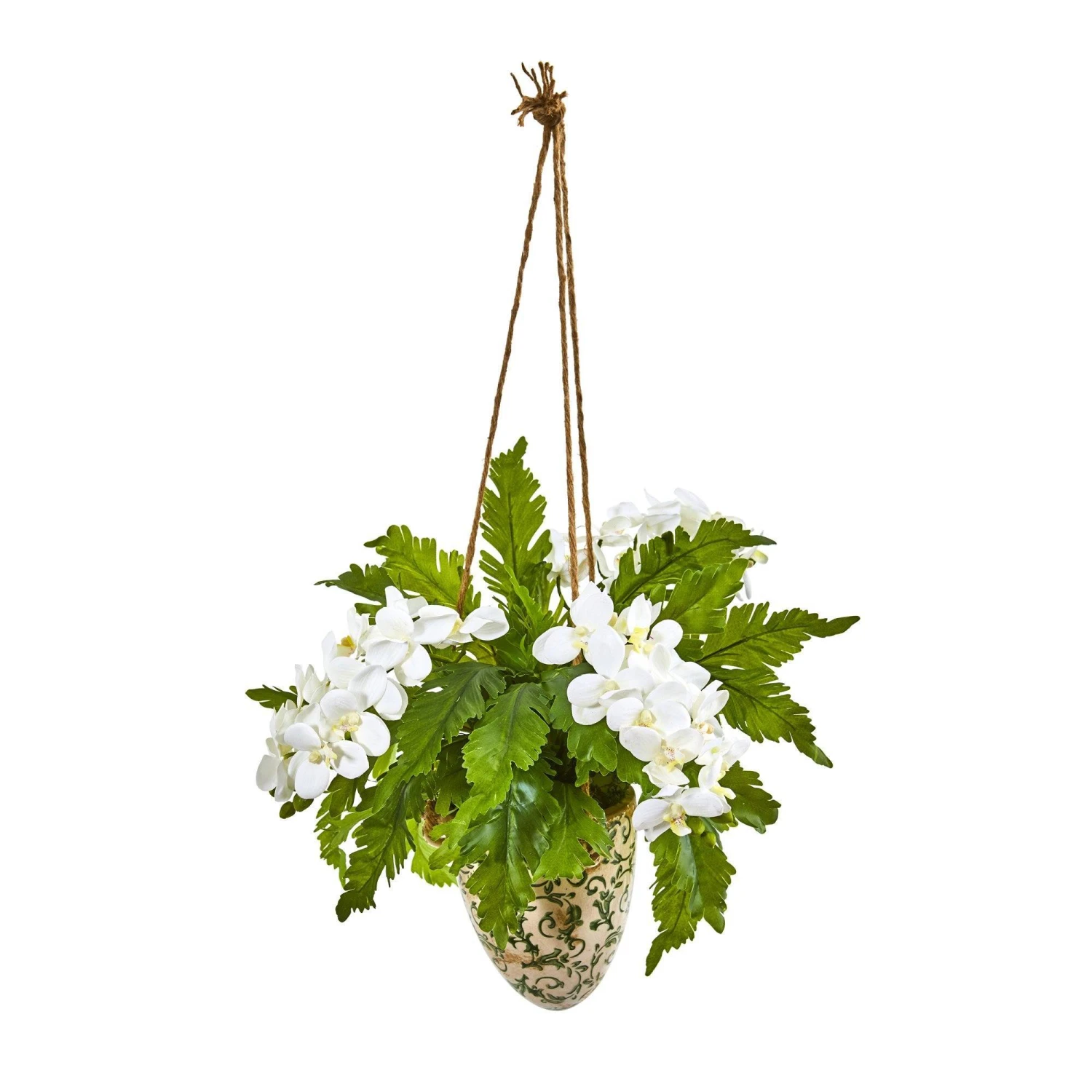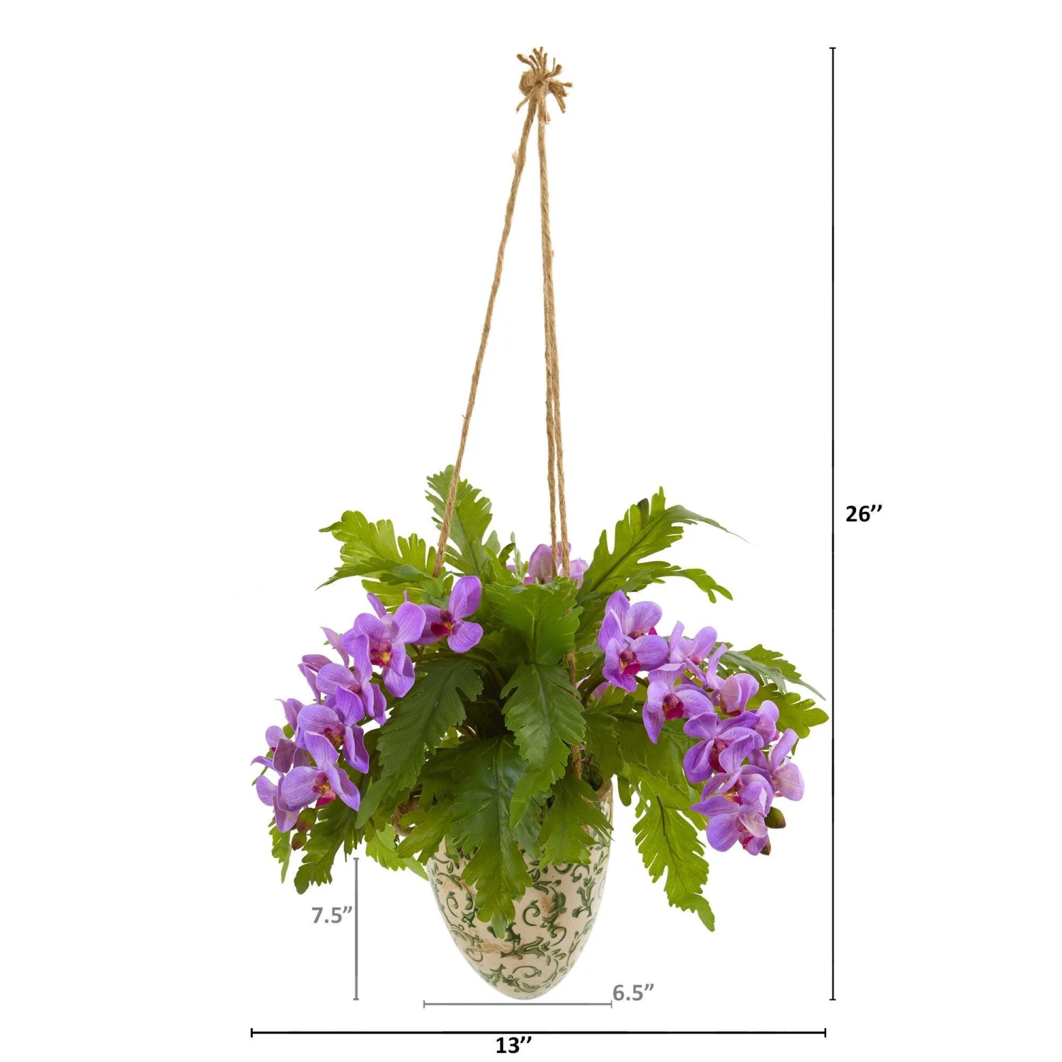 26” Phalaenopsis Orchid And Fern Plant In Hanging Vase