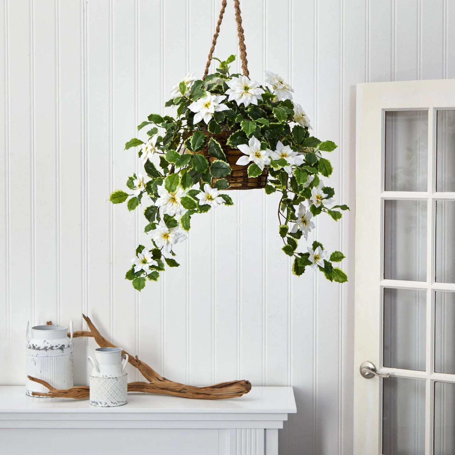 3.5’ Poinsettia And Variegated Holly Artificial Plant In Hanging Basket (Real Touch)