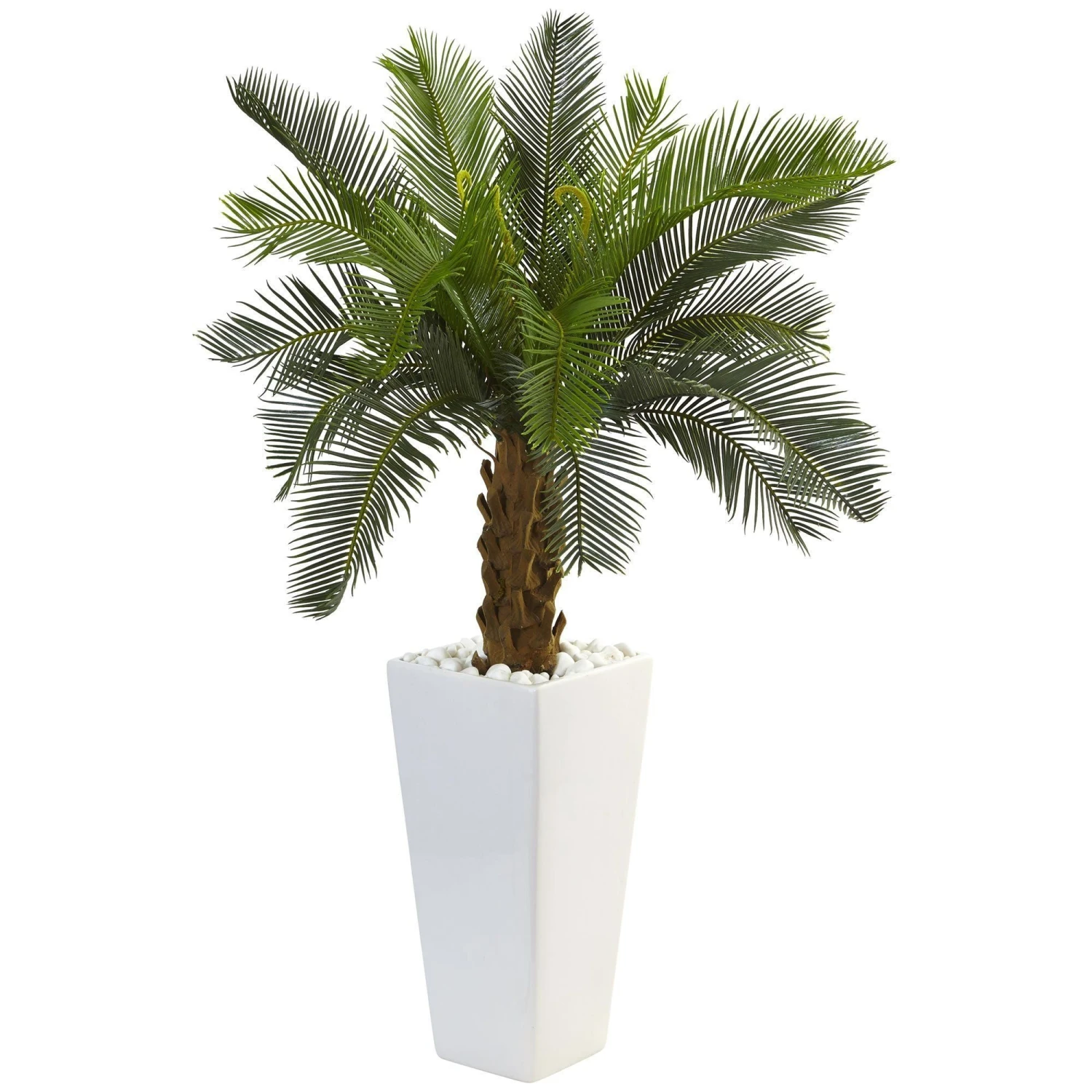 Quality craftsmanship from the finest materials makes this faux cycas tree look quite realistic. It features full green foliage fanning out from a lifelike stem. With a white planter topped with river rocks, the cycas can add a modern tropical touch to your indoor or outdoor living space.
