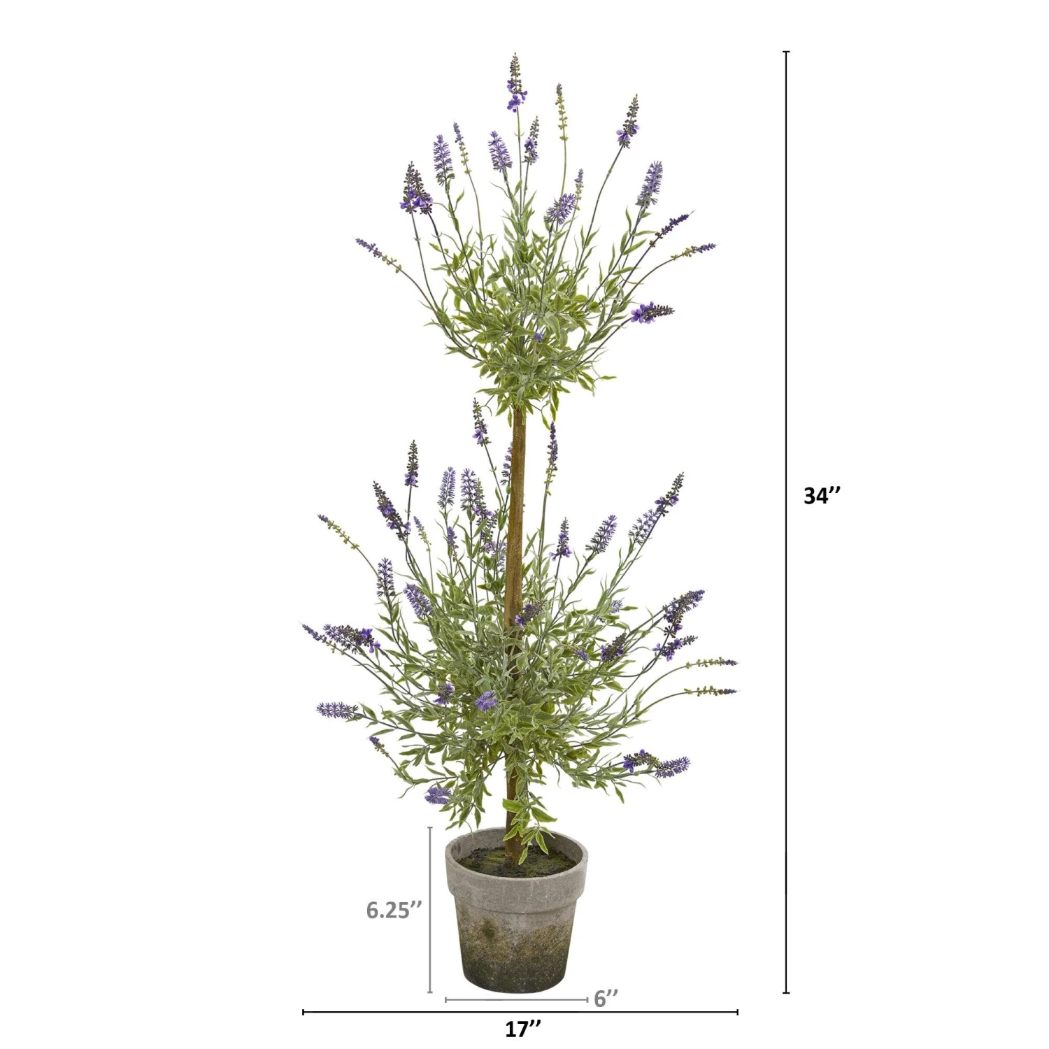 Sweetness comes to life in the shape of this artificial lavender topiary tree. Structured in a unique topiary form, this cheerful tree showcases hints of billowing lavender blooms, delicately mixed with soft hued greenery. Reaching 34” high, this quaint little addition is great for incorporating into country-inspired decor. Place it over a bedroom dresser for an enchanting touch.