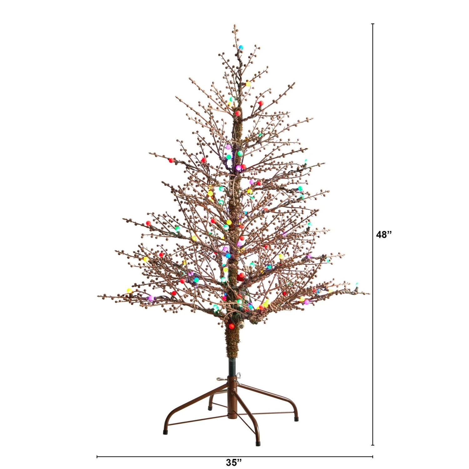 Are you seeking a different type of Christmas? The Charlie Brown Christmas Tree gets a modern makeover with this minimalist-inspired Frosted Berry Twig Artificial Christmas Tree. Lifelike twigs house 100 multicolored gum ball LED lights that are more energy-efficient and bring a rainbow of colors. Sparse by design, feel free to bend the branches and display your favorite ornaments or none at all! The stunning gum balls provide all the décor you need. Stabilized in a metal stand, this fake Christmas tree is 4’ high.