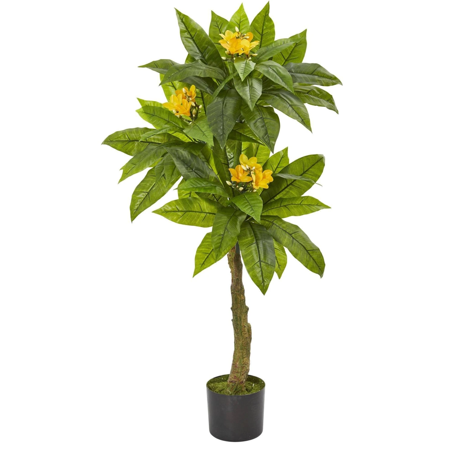 Lifelike leaves that have a realistic sheen are surrounding two vibrant yellow flowers on this plumeria artificial tree. With a UV-resistant feature, you can place this beautiful piece inside or outside your home. Arrange it on your front porch on either side of your entry door for a bright and colorful greeting when you come home.