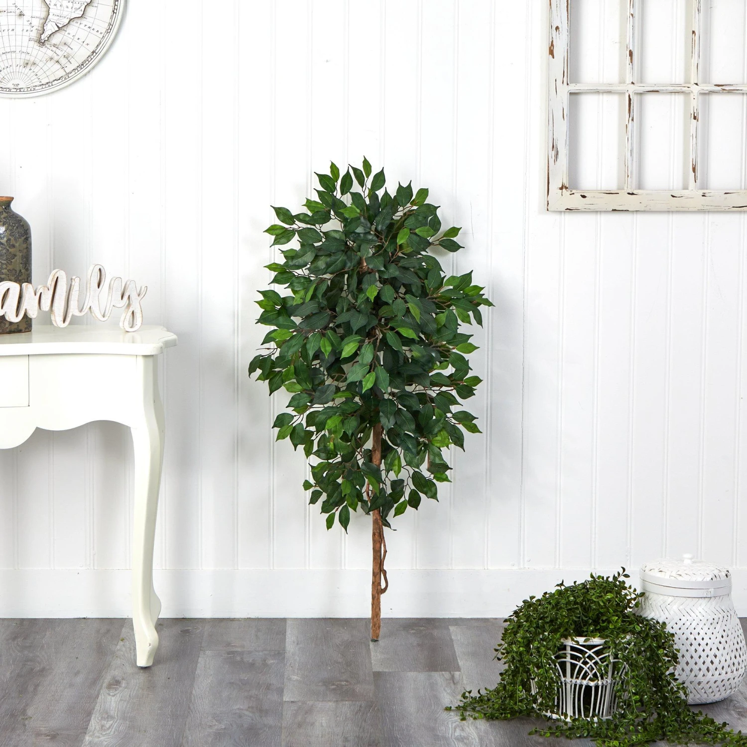 Make an elegant statement in your living areas with this Ficus Artificial Tree. A symphony of variegated Ficus leaves ranging from light to dark green stem from thin, easy to bend branches, creating a full look. The twisting trunks are incredibly lifelike, made from natural trunk. Stands 4′ and is perfect for you to DIY with your own planter. Perfect for apartments, low-ceiling areas, awkward corners, and bathrooms. Complements many décor styles.