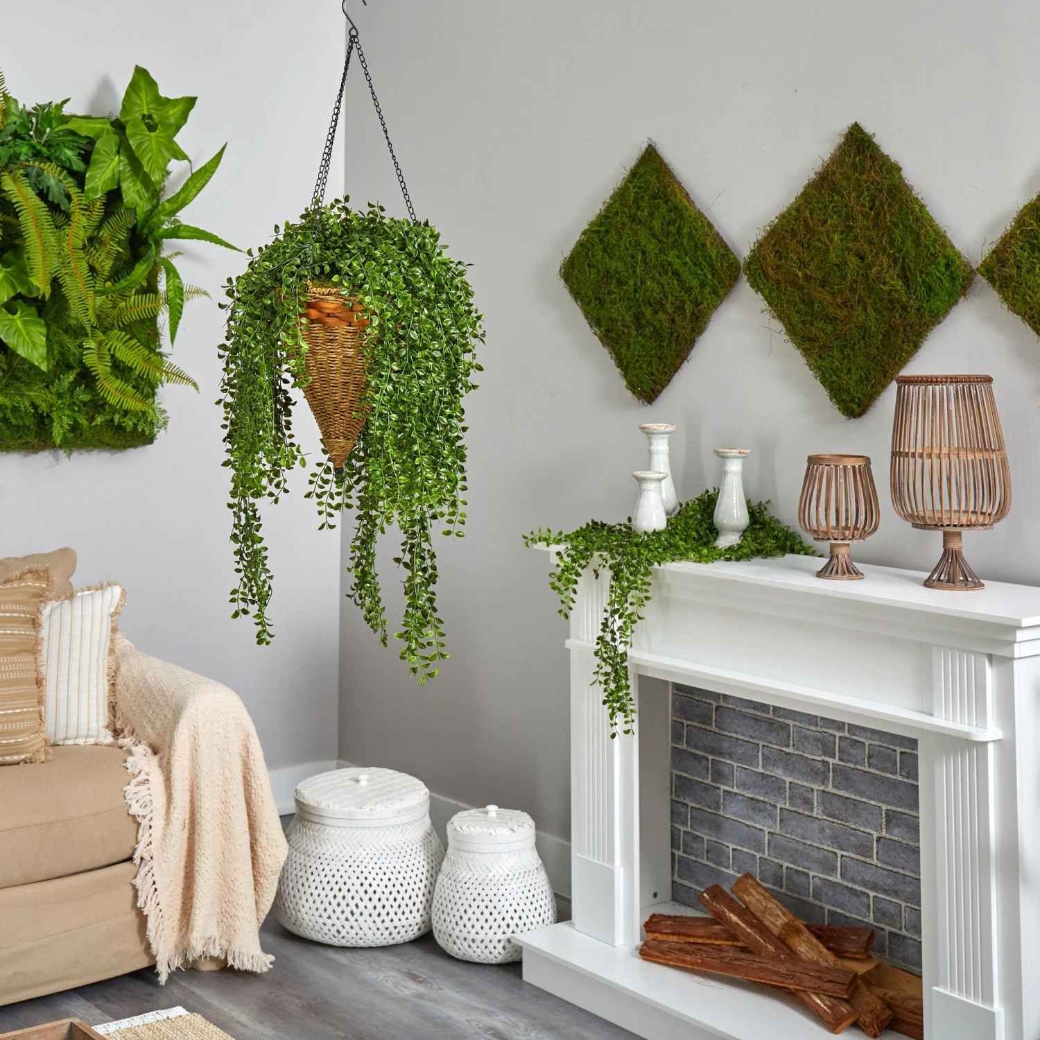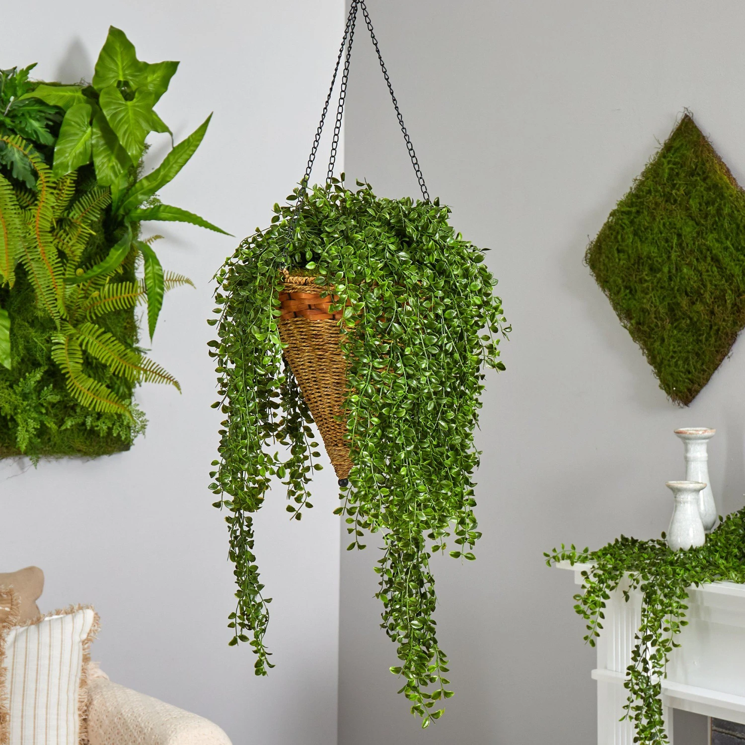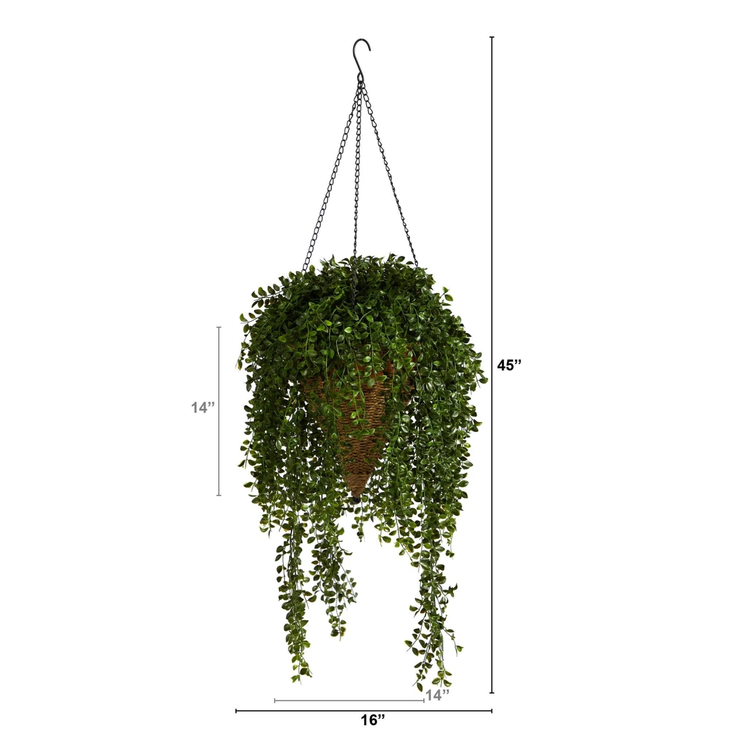 Tight on space? Need not worry with this Gleditsia artificial hanging plant. An overflow of Gleditsia leaves spill from a hanging basket for a fresh from the jungle look. Feel free to place outdoors; this faux plant is safe for indoor/outdoor areas. With a height of 45”, from top to bottom, curate in spaces that need a vertical refresh. Perfect for apartments, sliding patio door, near a window for a tropical look, or near the kitchen shelf.
