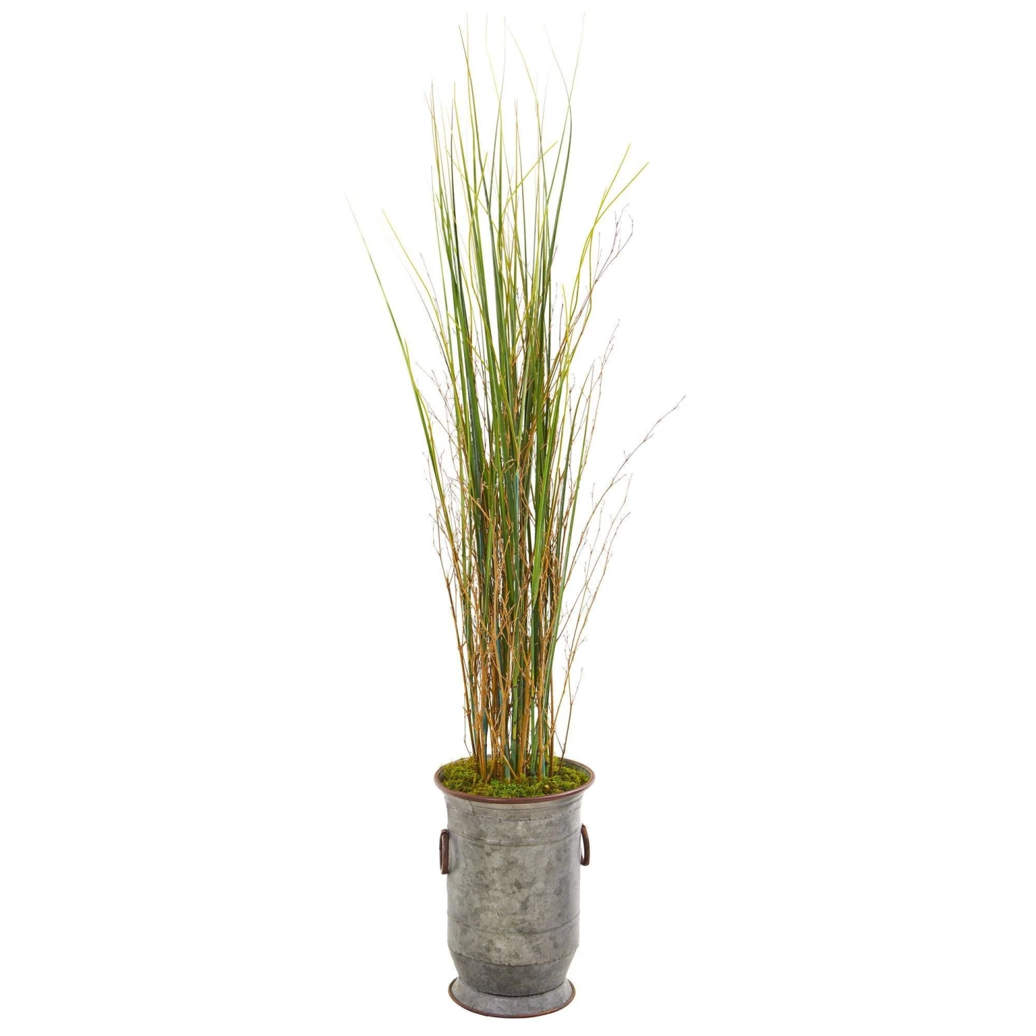 Spruce up tight, bare spaces with the help of this artificial plant showcasing an overgrowth of tall, slender strands of realistic grass and bamboo greenery that naturally fans upwards. Standing 45” high from a vintage metal planter stabilized with natural moss, this silk plant provides year-round freshness wherever displayed.
