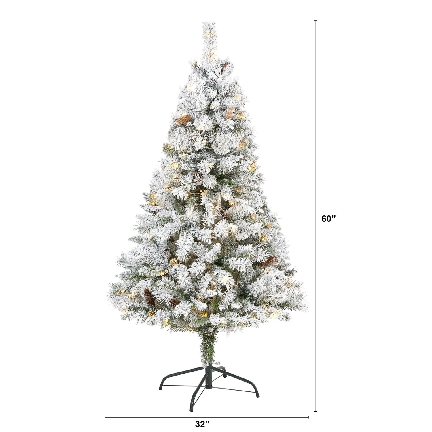 5′ Flocked White River Mountain Pine Artificial Christmas Tree With Pinecones And 150 Clear LED Lights
