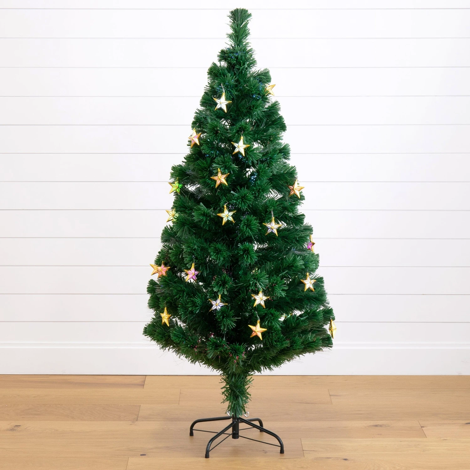 Make your home shine bright like a star with a lifelike artificial Christmas tree. Crafted from high-quality materials to ensure it keeps its’ charm year after year, it’s the perfect accent to bring your holiday decor together. The real treat is that it boasts star-shaped, energy-efficient LED lights that look like ornaments, but are better! These lights can switch hues, ranging from blue, yellow, purple, and more. The fiber optic lights have a dazzling appeal and have different light options: colorful and slow flash.The beauty of this tree is so impressive that you can save time and money by forgoing additional decorations – it stands spectacularly on its own. As it fills your space with Christmas magic, you’ll find it a stunning addition to any nook or entryway. At a compact 5′ and secured in a sturdy metal stand, it’s a versatile piece destined to bring life to your festive celebrations. And its compact size makes it a great space-saving piece and easy to store post-holiday season.