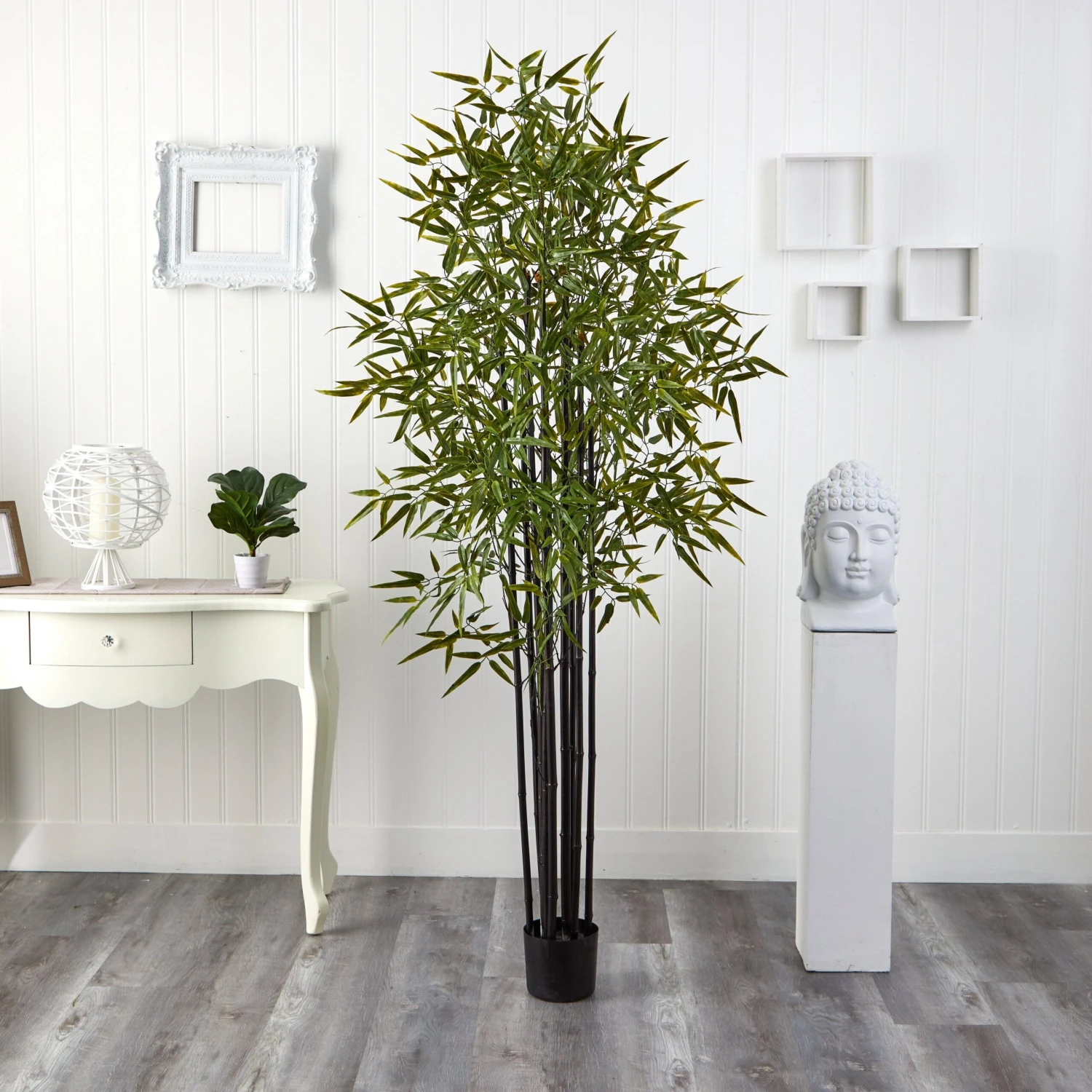 Sleek, black stalks protrude to the sky, towering at 6 ft. tall. Adorned with 1,470 UV resistant leaves, this nine-stalk black bamboo tree is suitable for both indoor and outdoor use. Add height to a room needing more dimension, or place in the workspace for an added sense of calm and serenity.