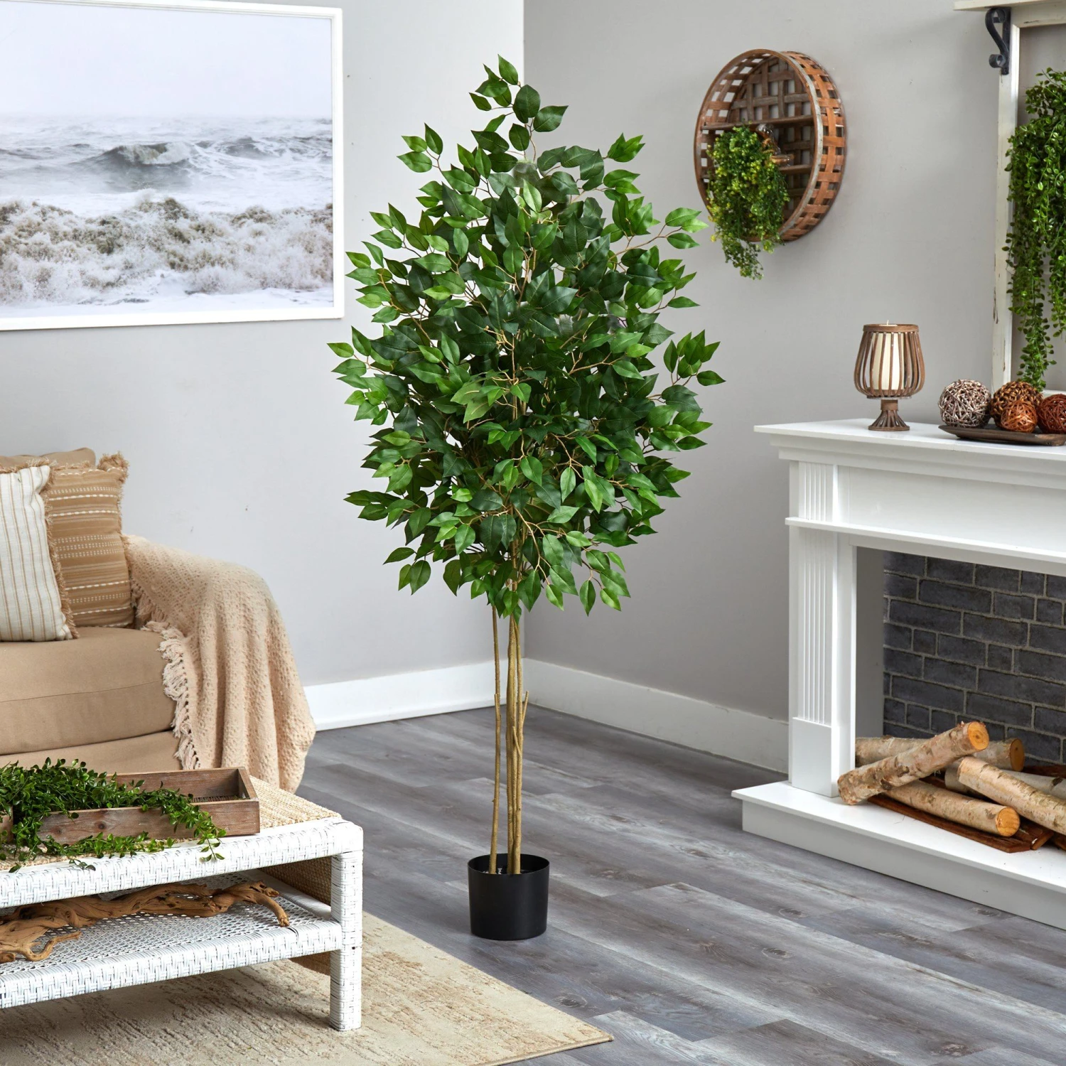 Make an elegant statement in your living areas with this Ficus Artificial Tree. A symphony of variegated Ficus leaves ranging from light to dark green stem from thin, easy to bend branches, creating a full look. The twisting trunks are incredibly lifelike because they’re made from natural trunk. Stands 64″ and is UV resistant, making it safe for outdoor use.. Perfect for foyers, backyards, awkward corners, and bathrooms. Complements many décor styles.