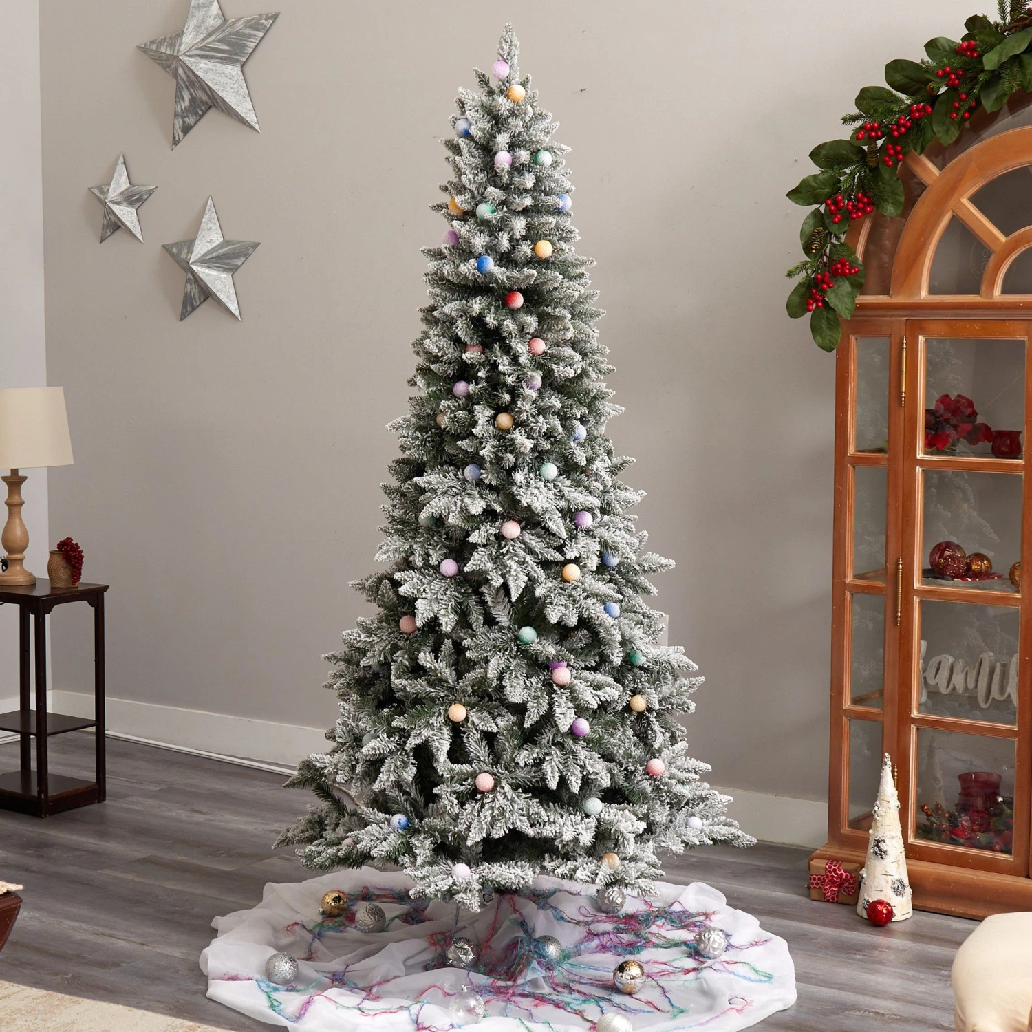 7.5′ Flocked British Columbia Mountain Fir Artificial Christmas Tree With 95 Multi Color Globe Bulbs And 1113 Branches