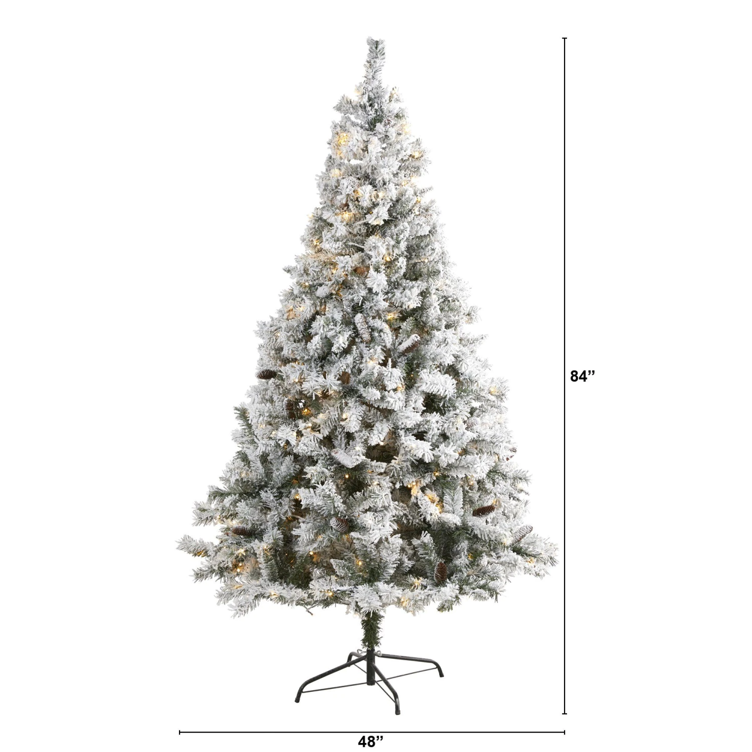 7′ Flocked White River Mountain Pine Artificial Christmas Tree With Pinecones And 350 LED Lights