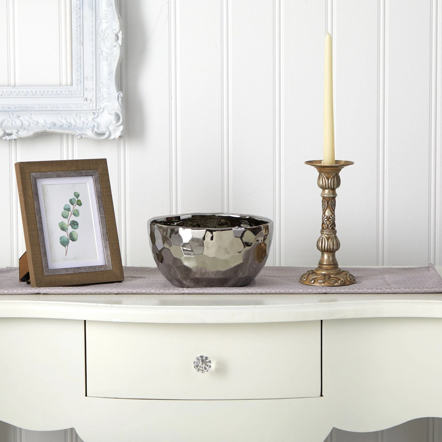 Add some glam to your space with this Designer Silver Bowl. If you want to bring attention to your greenery, look no further. Texture, color, and glare all in one. Perfect for Hollywood glam, modern, and many other décor styles. With a width 8.75″, this bowl will attract attention wherever displayed. House hydrangeas, roses or other flowers.