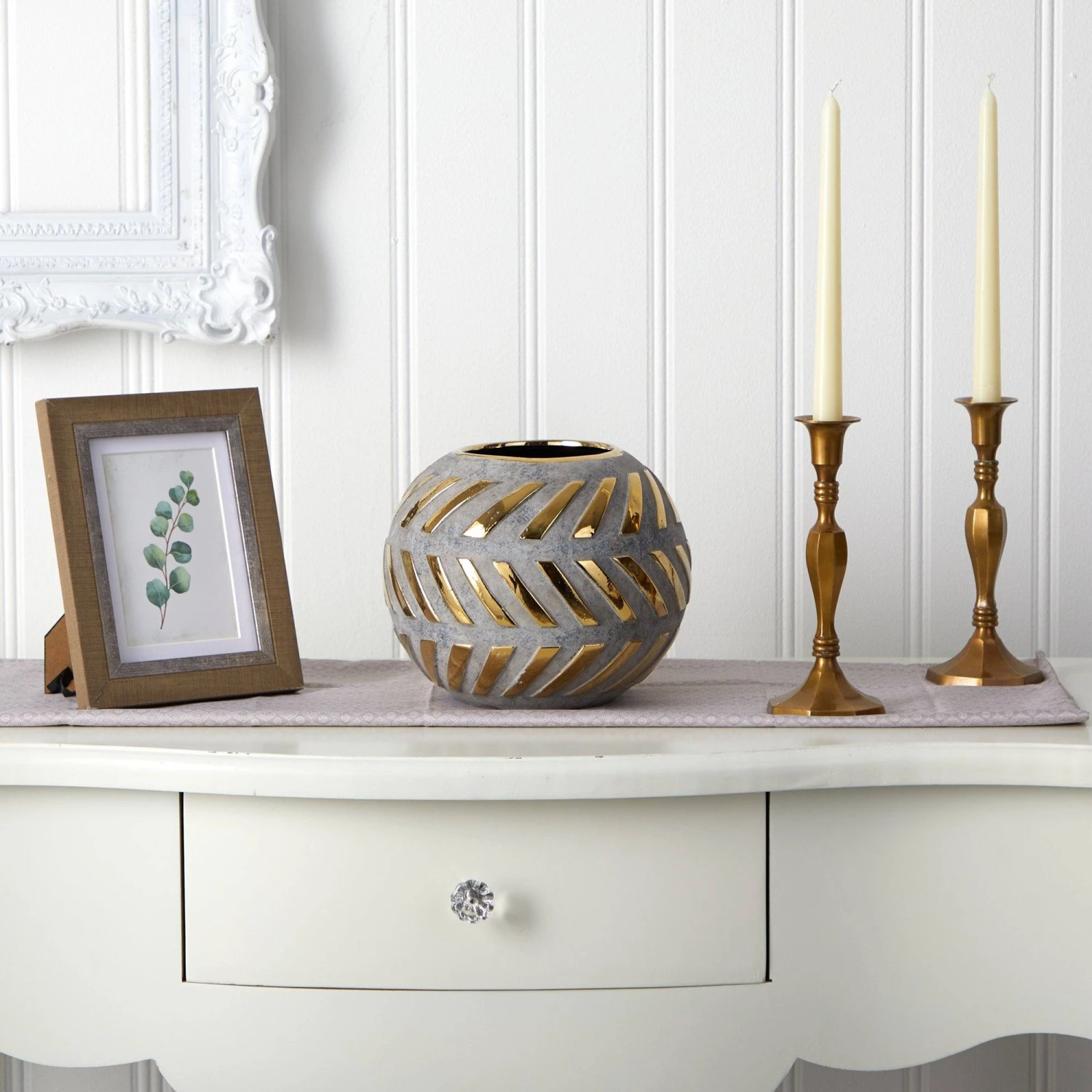 Love your new plant but not the planter? It’s your lucky day with this Stoneware Oval Vase with gold trimmings (Set of 1). DIY your own faux-bolous arrangement easily, effortlessly and confidently by adding your own finishing touches. If you’re into Hollywood glam or mid-century modern, you’ll love this ceramic vase’s gold trimmings against the stoneware base. With a width of 8″, you can set in a tabletop aganist a walled mirror for a chic look. No drainage holes.