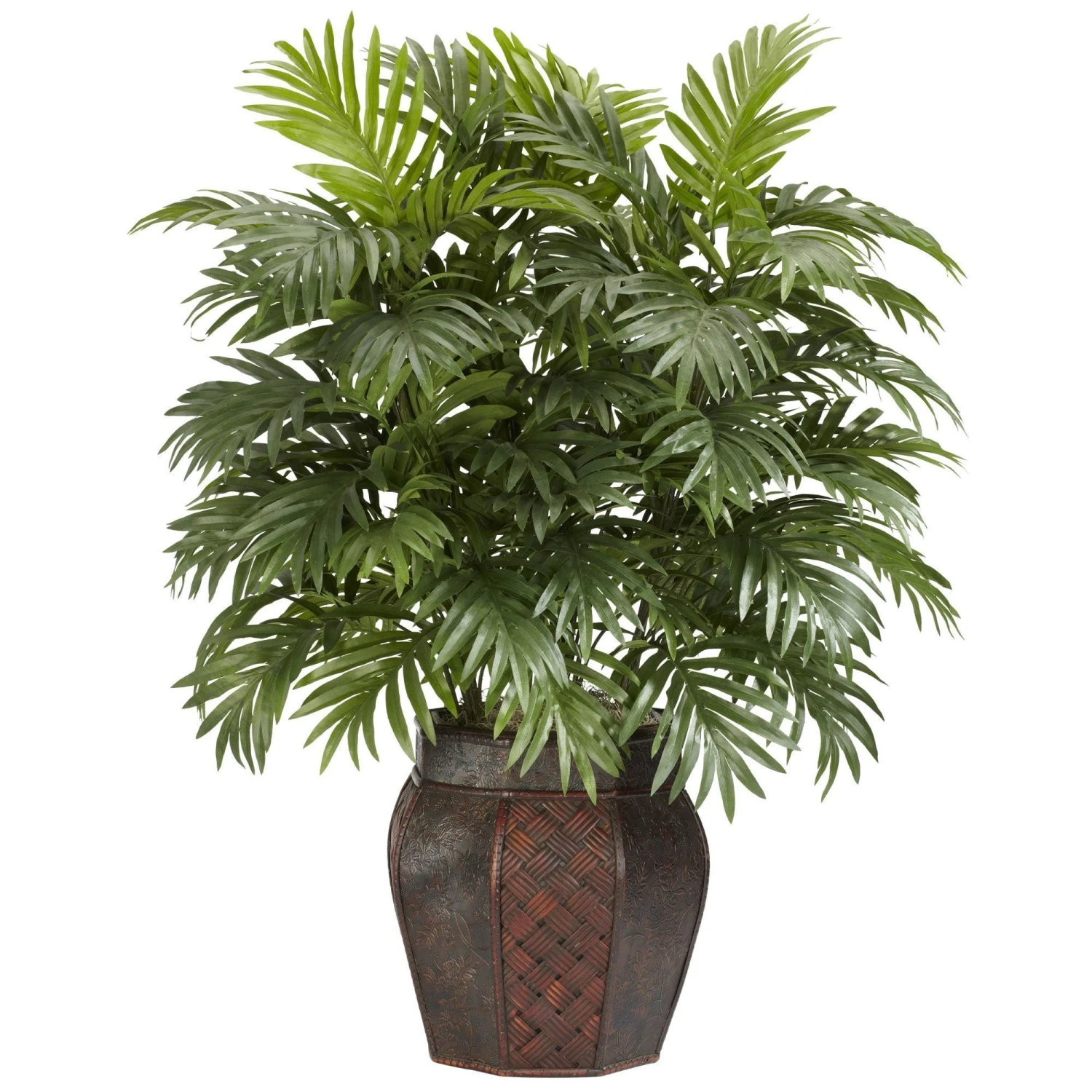 Put down the machete! The Areca Palm with its thick lush leaves is the bane of jungle travel, but perfect for improving the mood of any room. Hailing from Madagascar, the Areca Palm, with its deep rich tropic décor, is sure to delight anyone who dreams of relaxing on a beach surrounded by greenery. Reaching upward at 38 inches and complete with a decorative patterned vase, it’s an elegant addition anywhere.