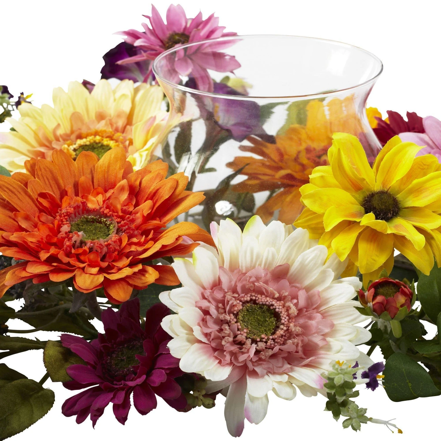 Here’s a sunny, cheery arrangement that’s both practical and diverse. This Africa Sunflower Candelabrum fills any surface with a wide range of colors and textures. With a full 28″ spread, it won’t be overlooked, and the eclectic mix of blooms, stalks, and greenery call attention to the glass candelabrum in the center (candle not included). Makes an ideal showpiece and/or gift. Assembled in the USA from high-quality materials, this silk flower candelabrum is incredibly lifelike. Designed and approved by horticulturists that aspire to recreate nature’s beauty with every stem, this realistic rendition is sure to impress all. Looking to enhance family dinner? Display this candelabrum in the dining table for an intimate gathering. With the vivid hues, curate during those warm summer months. No matter your décor style, this candelabrum blends with any existing décor.