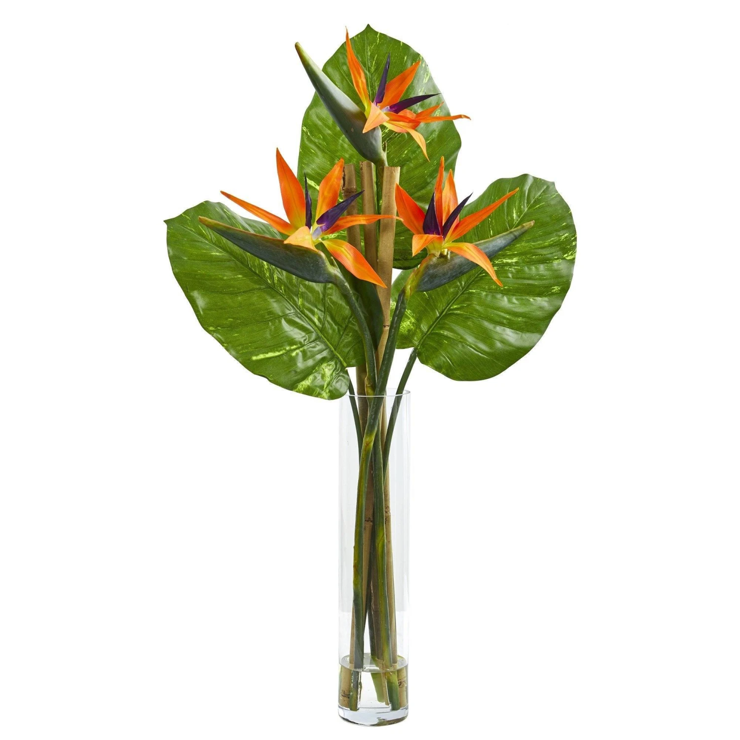 Several large green leaves with a natural-looking sheen are set as the backdrop to unique orange blooms in this artificial bird of paradise arrangement. With its natural appearance, this ornament is suitable for contemporary- or minimalist-styled homes. Settle this as a centerpiece on your breakfast nook table next to a dessert stand and glass pitcher to bring a garden accent to the space. A clear cylinder vase comes included filled with faux water.