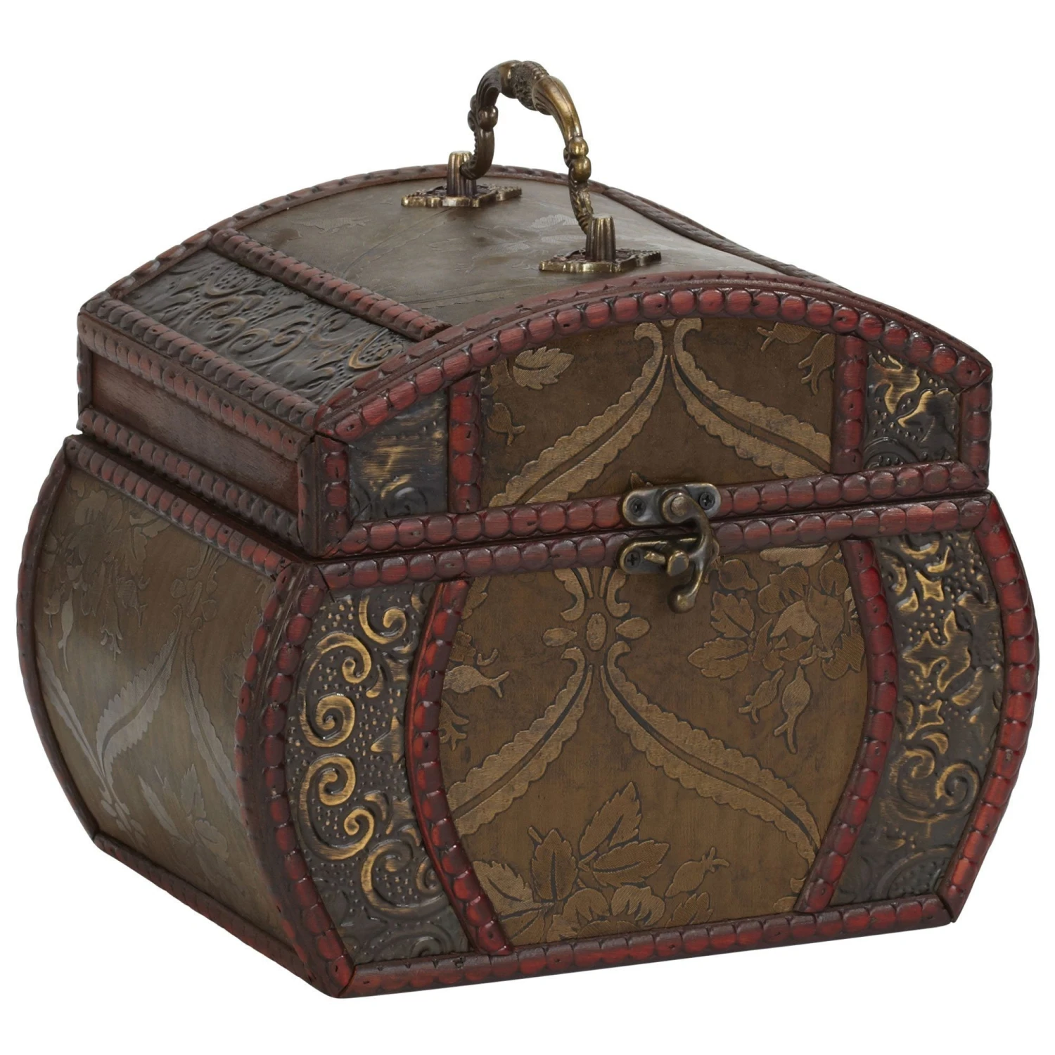 Take a moment to admire the intricate design work on both boxes. Notice the curved abstract floral designs on the side set against the dark olive background, while the middle is a detailed floral pattern separated by vivid wine colored segmented trim. And to top it off, they come with an intricately designed handle and a clasp to secure belongings. Have you ever seen something so elegant?