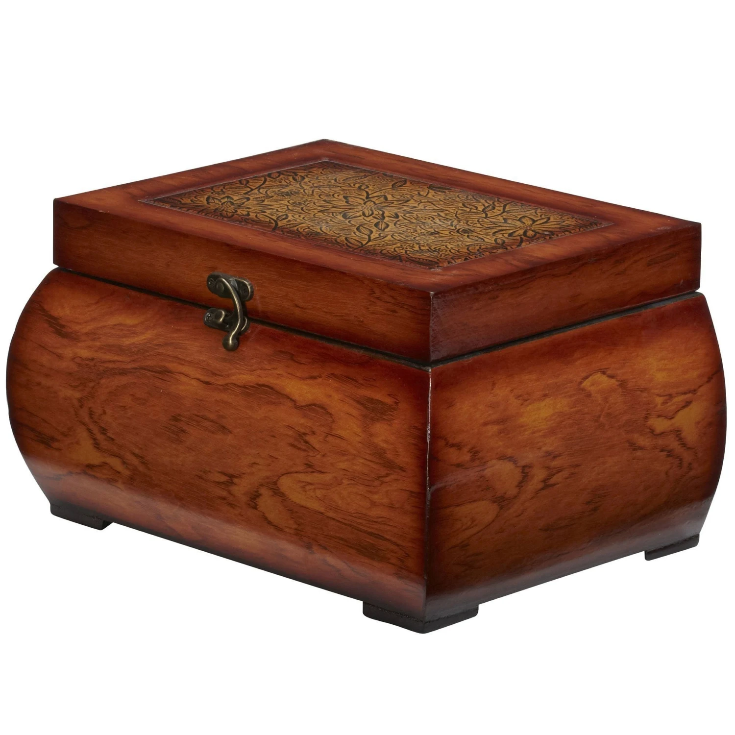 Ok, who doesn’t want a set of beautiful wood boxes? We didn’t think so… This set’s larger piece is 6.5 inches high, 11.25 wide and 8.25 inches deep, while its companion is 5.25 inches high, 8.5 inches wide, and 5.5 inches deep for ample storage. The breathtaking grain pattern is accented by a shiny gloss finish giving it a wide variety of color sheen. A simple clasp attaches to the top where one can admire the intricately designed floral artwork.
