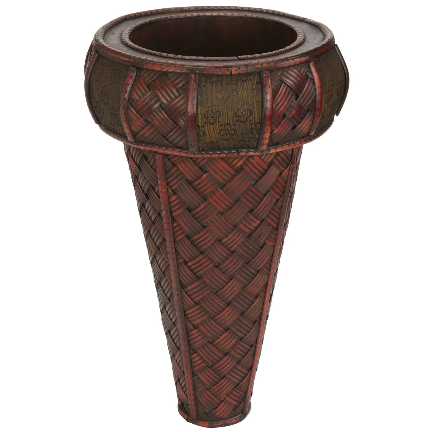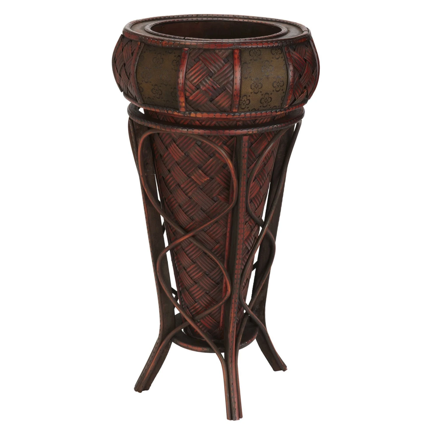 This Vase with stand is perfect for those enjoying an elaborate collection of textures and colors. Resting in a vivid burgundy holder with intertwining designs, the island-inspired cross thatch mat design peeks out at admirers, demanding a closer look. Then the rim boasts two different alternating patterns, creating a rich blend of colors and shapes. Perfect for any home or office, and makes a great gift, too.
