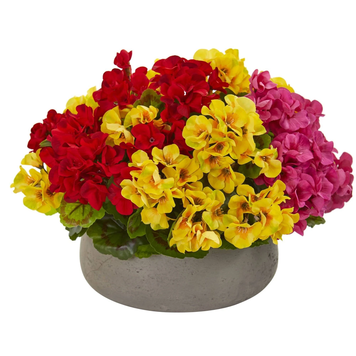 Soft foliage peeks out from beneath numerous bundles of vivid blooms with this 12-inch artificial geranium plant. Coming in a stone planter, this ornament is UV-resistant, making it an excellent choice to highlight an outdoor window sill or patio table as a centerpiece. To create a full garden display, add other potted artificial greenery to complement this piece.