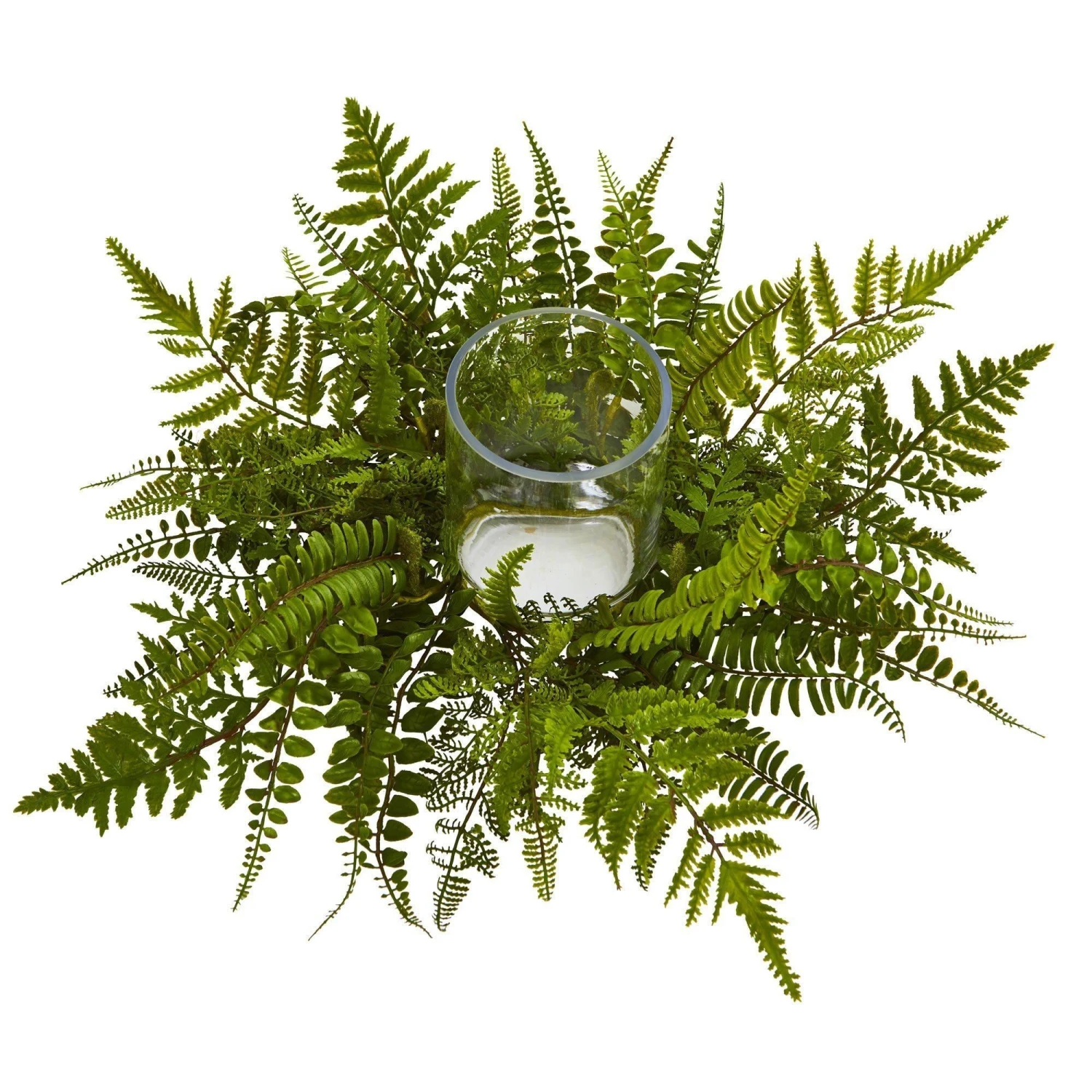 Imagine the flicker of candle light through the dense green artificial ferns of this beautiful mixed fern candelabrum. The ferns are spun expertly around the clear glass in a splendid display. It’ll look great as a centerpiece for your living room table.